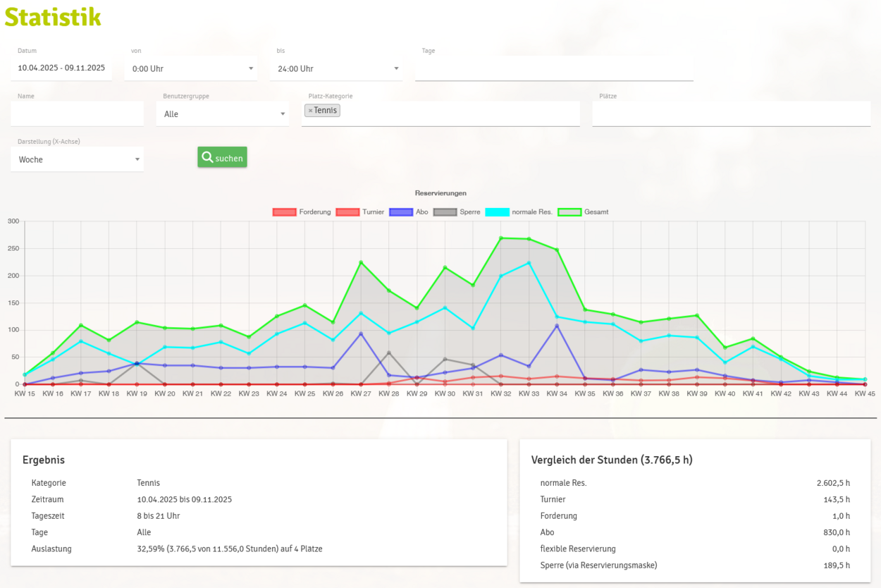 Von 12.04. bis 07.11.2025 wurden insgesamt 3766 Stunden Tennis auf unserer Anlage gezeigt.